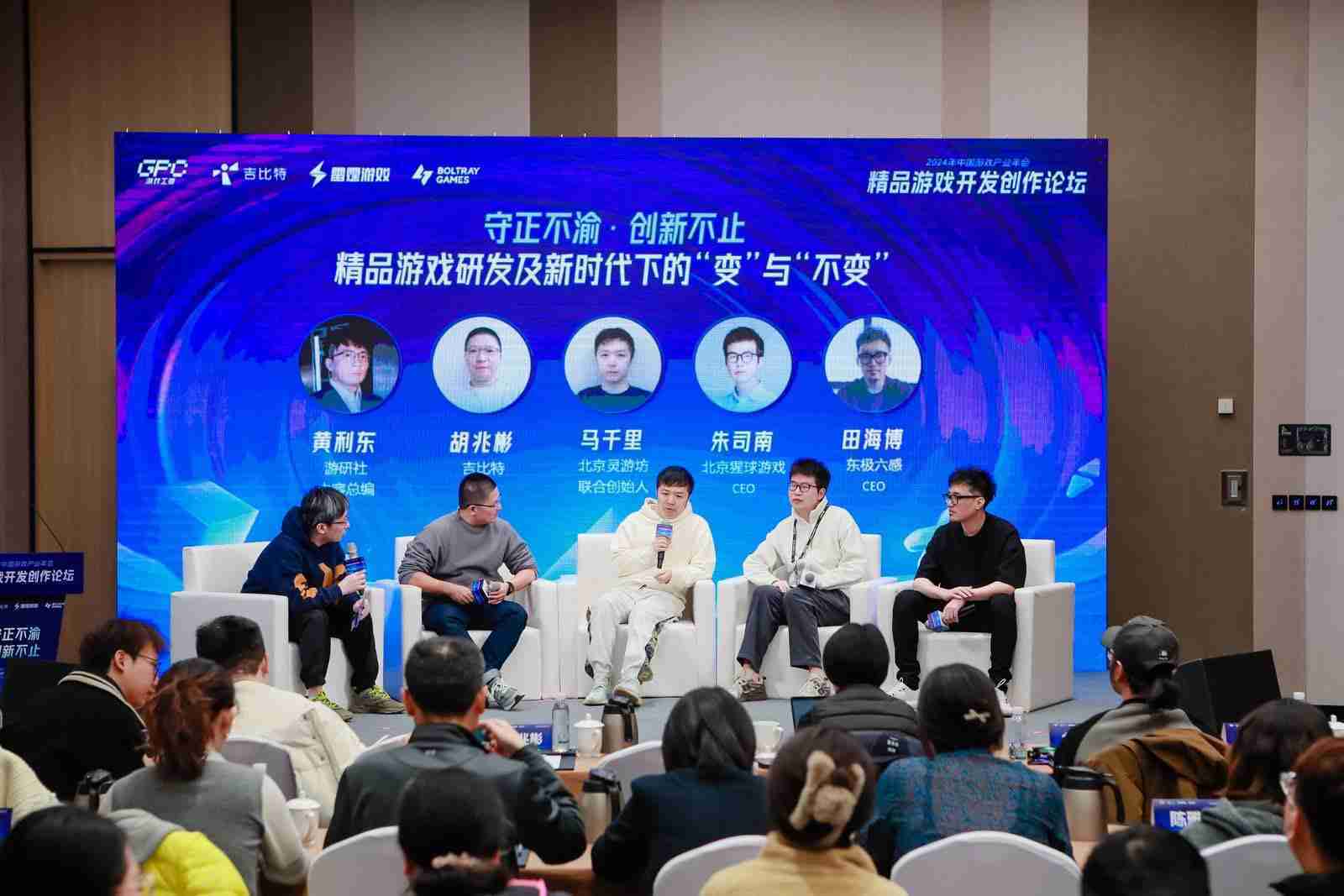 圆桌对话环节,,,,在游研社内容总编黄利东的主持下,,35273CTO胡兆彬、、北京灵游坊联合创始人马千里、、北京猩球游戏CEO朱司南、、东极六感CEO田海博等四位嘉宾围绕“守正不渝、、创新不止——精品游戏研发及新时代下的‘变’与‘不变’”这一主题分享了各自在精品游戏开发理念及工程能力搭建方面的见解和经历,,并就行业变化下游戏人需要坚守的理念等展开交流探讨。。