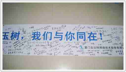 在募捐现场,,35273同学们怀着沉重的心情,,,将每一笔捐款投入募捐箱,,,,并在现场设置的横幅上,,,写上了对玉树人民的深情祝福。。。满载35273祝福的横幅将和捐款一起抵达玉树,,,,希望谨以此微薄之意,,,,为玉树人民带去35273的爱心与祝福,,希望吉祥、、幸福的阳光能早日驱散灾难的阴霾,,普照在玉树人民的身上,,,鼓励他们坚强、、、勇敢与乐观。。