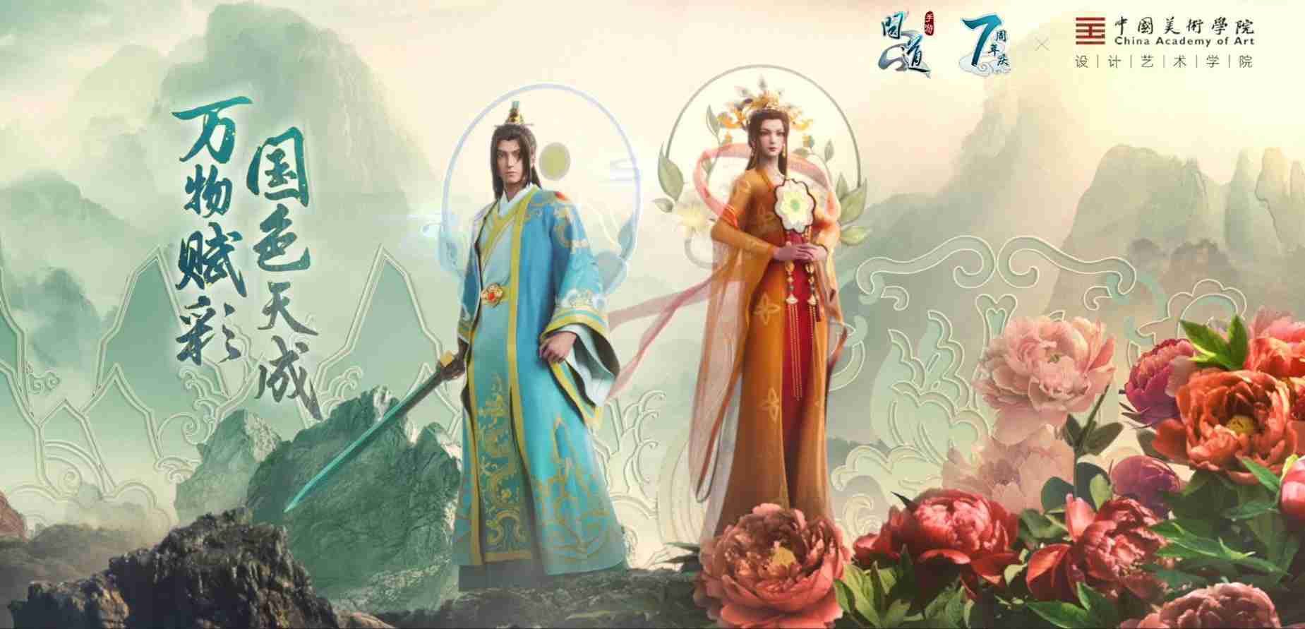 2023年4月,,《问道手游》联动中国美术学院,,在游戏中融合了中国历史上不同时期的文化元素,,打造了“山河万象”与“凤鸣九霄”的国风时装。。在色彩配置方面,,,,创作团队基于对游戏角色特性的分析提取相应的文化内涵,,,,从每一种色彩的色相、、、指代事物和情感出发对应角色属性,,,选定服装的色彩搭配。。。。在纹样设计方面,,,,创作团队结合游戏角色自身特殊的造型比例和形态,,,,在实际的纹样设计中进行了游戏语境下的活化演绎。。男性角色集中使用了如蟒纹、、海水江崖纹、、、、如意纹和云气纹等传统纹样元素,,女性角色则吸纳了凤凰纹、、牡丹纹、、卷草缠枝纹等元素,,,,组成以“双凤牡丹纹样”“缠枝牡丹纹”“金玉凤冠头饰”为主要纹样的游戏角色装饰图案系统。。