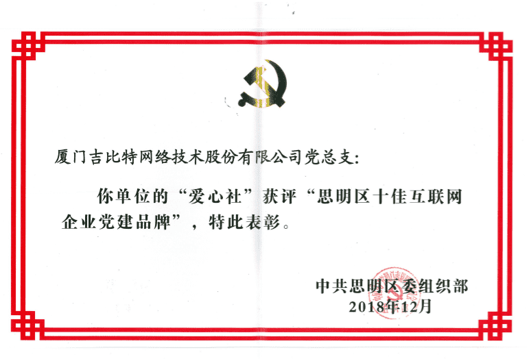 经初审评选、、、网络评选和专家评审等环节,,,,"厦门35273网络技术股份有限公司党总支-爱心社" 从全区28个参评党建品牌中脱颖而出,,获评"思明区十佳互联网企业党建品牌"。。。